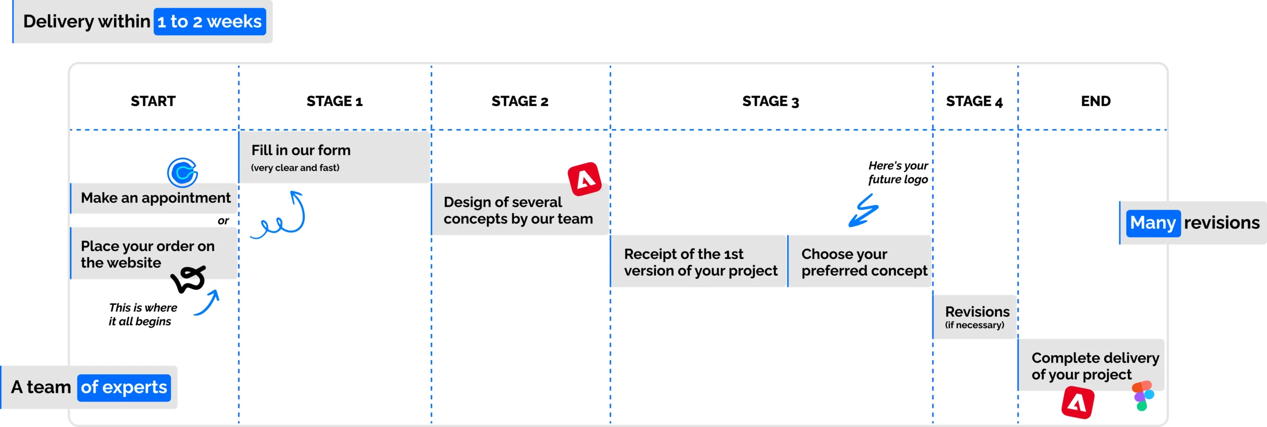 We work efficiently to deliver your first proposals in less than 48 hours. The total time depends on the revisions requested, but we make it a point of honor to meet your deadlines.