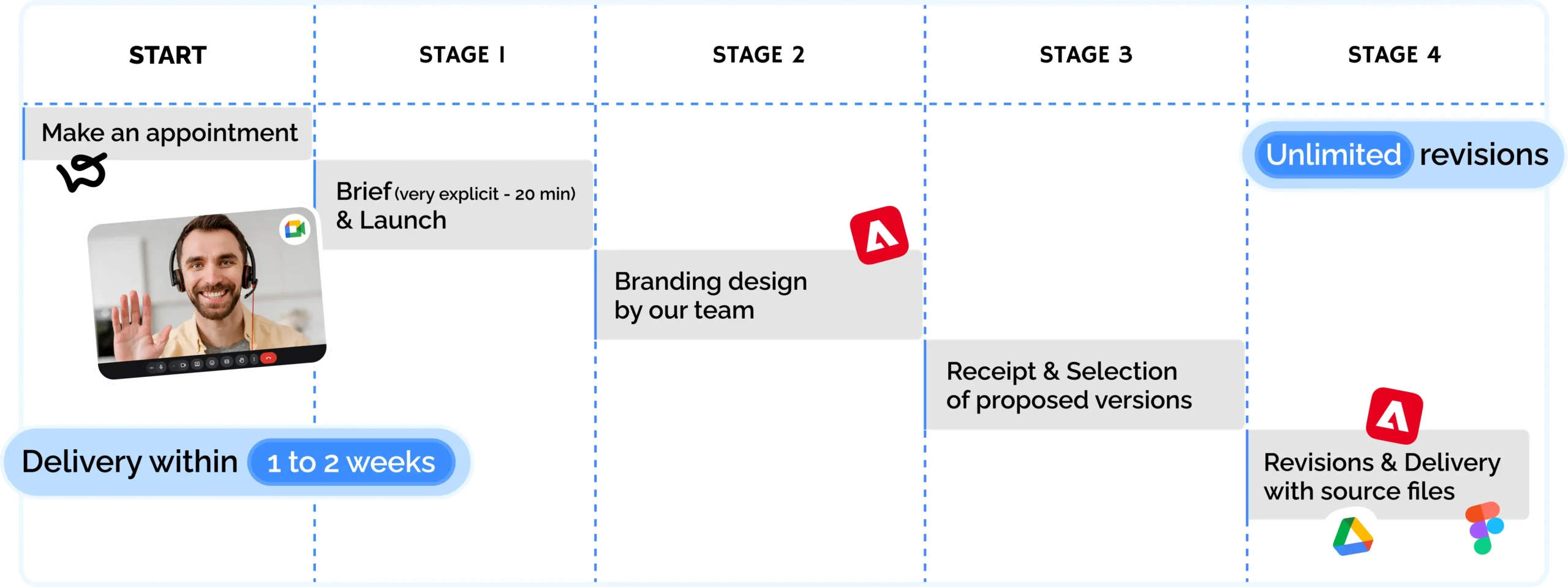 AI tools produce generic logos, often poorly adapted to your market or vision. When you choose us, you benefit from human expertise, tailor-made creativity, and a result that tells a unique story : yours.